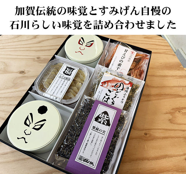 ■加賀伝統のごりの佃煮、花くるみ煮はオリジナルの歌舞伎絵に仕上げた山中塗容器に。