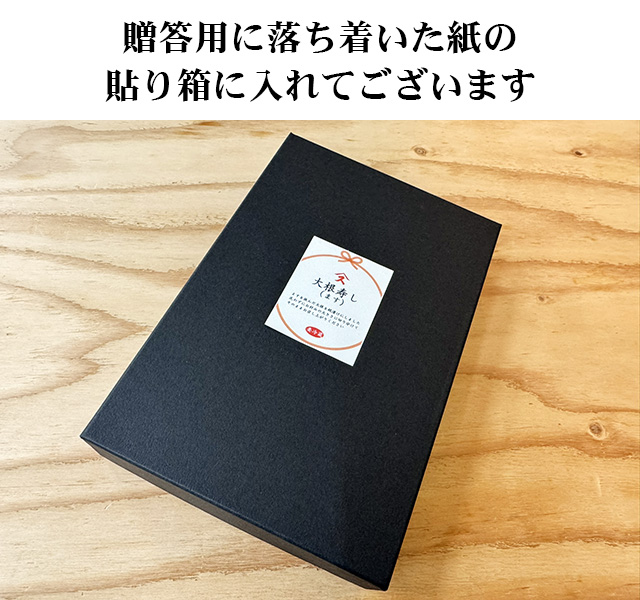 ▲すみげんのFacebookはこちらから▲▲すみげんのInstagramはこちらから▲ 珍味のすみげんTOP 季節限定【旬の味】マスの大根寿し(冬季限定) すみげんのギフト 大根寿しマス(化粧箱入り)350g 価格: ¥2,268 (税込) [ポイント還元 22ポイント~] 販売期間: 数量: 個 在庫 在庫あり 返品についての詳細はこちら 冬季限定の味覚です(11月~2月頃まで) ■マスを使った変わり種の大根ずしです。糀の優しい甘みと大根のアッサリとした食感をお楽しみいただけます。 ■寒い季節限定の山海の幸が織りなす味のハーモニーを是非一度お試しください。 ■賞味期限:7日間 クール便発送 ■保存方法:冷蔵保存(冷凍はしないでください) 大根寿しマス(化粧箱入り)350g 価格: ¥2,268 (税込) [ポイント還元 22ポイント~] 販売期間: 数量: 個 在庫 在庫あり 返品についての詳細はこちら 商品規格 商品名 大根寿しマス(化粧箱入り) 原材料 大根・ます(サケ類)・人参・昆布・唐辛子・漬け原材料(米・糀・佐藤・食塩・食酢)・トレハロース・酸味料・酸化防止剤(ビタミンC) 内容量 350g 賞味期限 7日 保存方法 冷蔵保存(冷凍はしないでください) 備考 クール便発送 page top 大根寿しマス(化粧箱入り)350g 価格: ¥2,268 (税込) [ポイント還元 22ポイント~] 販売期間: 数量: 個 在庫 在庫あり 返品についての詳細はこちら この商品を買った人はこんな商品も買っています かぶら寿し1切真空パック(160g前後) ¥1,404(税込) 在庫切れ(季節限定品の場合もあり) かぶら寿しご自宅用バラ売り(500g) ¥3,672(税込) 在庫切れ(季節限定品の場合もあり) かぶら寿し(化粧箱入り)500g ¥3,888(税込) 在庫切れ(季節限定品の場合もあり) かぶら寿し(化粧箱入り)720g(4切) ¥5,616(税込) 在庫切れ(季節限定品の場合もあり) かぶら寿しご自宅用バラ売り(700g) ¥5,140(税込) 在庫切れ(季節限定品の場合もあり)